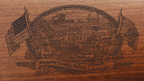 Detailed engraving on both sides of the American walnut forearm, with the name and establishment date of your parish on the right side and your state name and nickname on the left side.