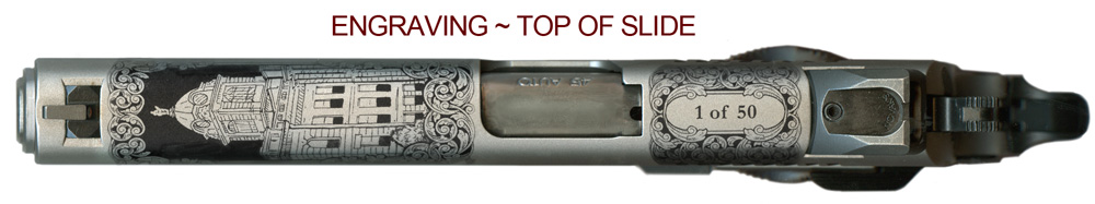 The right side, left side, and top of the stainless steel slide is engraved with elaborate artwork.