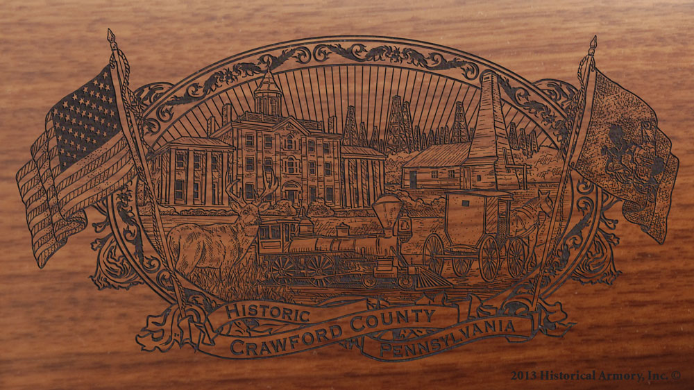 The right side of the American walnut buttstock is engraved with an intricate, original piece of artwork that captures the unique history of your county, while the left side is reserved for custom personalization.