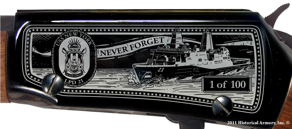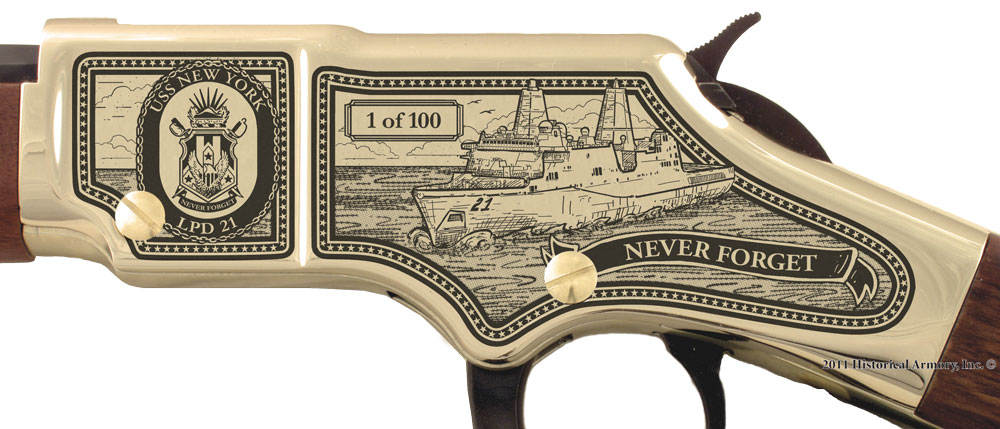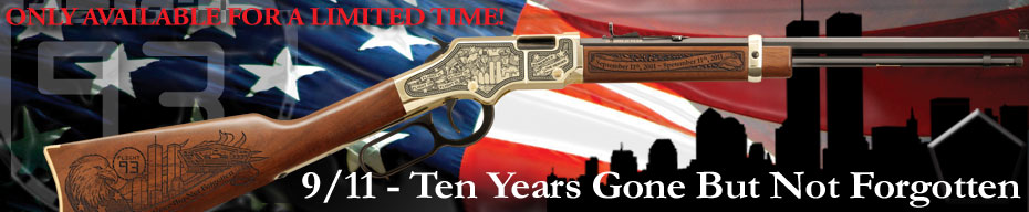 Available on the affordable, American-made Henry H001 and H004 “Golden Boy,” the 9/11 Tenth Anniversary Limited Edition Rifle features original artwork and highly-detailed laser engraving of images inspired by September 11th, including the remarkable USS New York, a state-of-the-art amphibious transport dock ship forged with 7.5 tons of steel recovered from the World Trade Center in her bow. Like a phoenix rising from the ashes, the USS New York represents the enduring strength of America and guarantees that we will never forget what happened on 9/11.