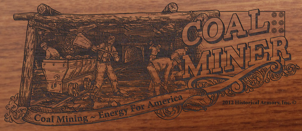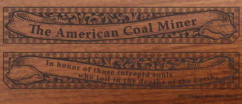 Detailed engraving on both sides of the hardwood forearm, with "The American Coal Miner" on the right side and "In honor of those intrepid souls who toil in the depths of the Earth." in the banner on the left side.