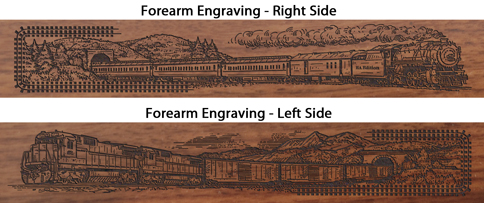 Detailed engraving on both sides of the American walnut forearm, with a steam locomotive passenger train on the right side and a diesel locomotive hauling freight on the left side.