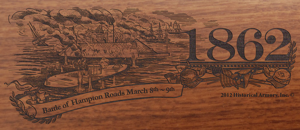 The right side of the American walnut buttstock is engraved with an intricate, original piece of artwork that depicts the historic naval battle between the CSS Virginia and the USS Monitor in March 1862, while the left side is reserved for custom personalization.