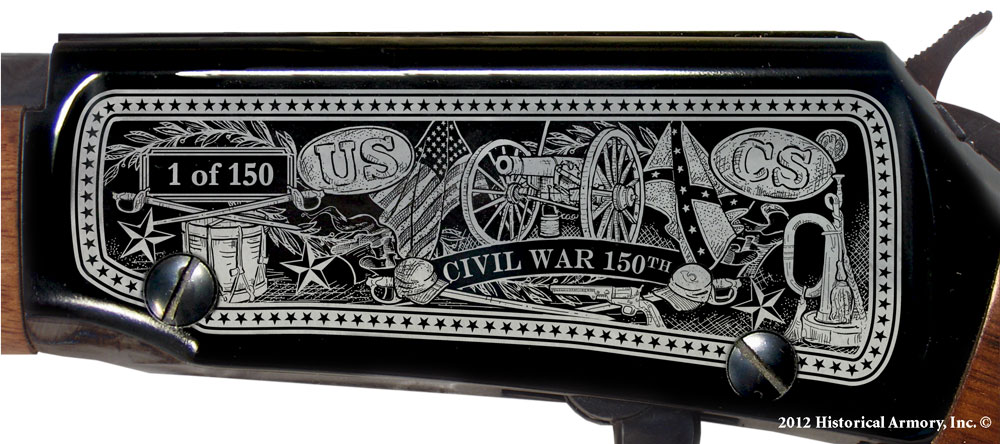Detailed engraving on both sides of the American walnut forearm, with the Civil War 150th Anniversary dates on the right side and a Union, Confederate, or Border state-specific banner on the left side.