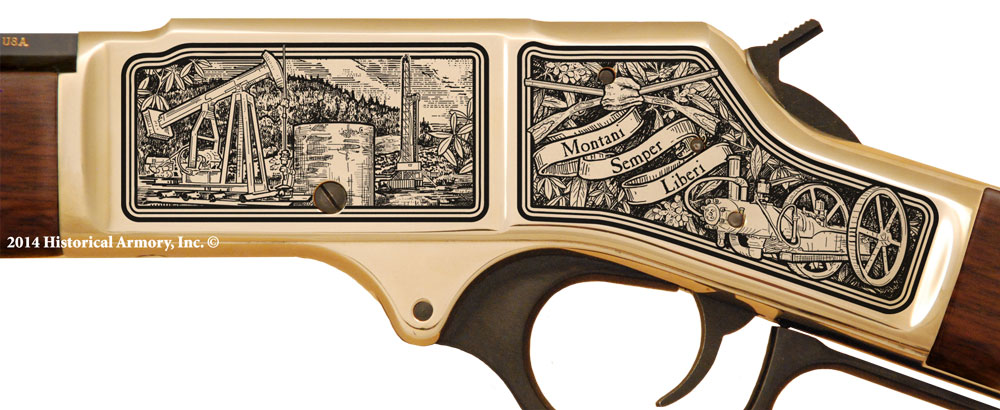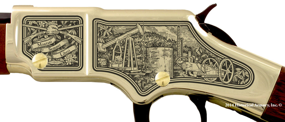 In honor of West Virginia’s essential role in securing America’s energy future, Historical Armory is proud to present the West Virginia Oil & Gas Limited Edition Rifle. Available on the fully functional, American-made Henry H001 .22LR, the H004 .22LR “Golden Boy”, the H006 "Big Boy" (not pictured) and the Henry H009B .30/.30, the West Virginia Oil & Gas Limited Edition Rifle features original artwork, detailed engraving, and optional personalization, all designed to commemorate the oil and gas industry of West Virginia, one of America’s leading energy producing regions.