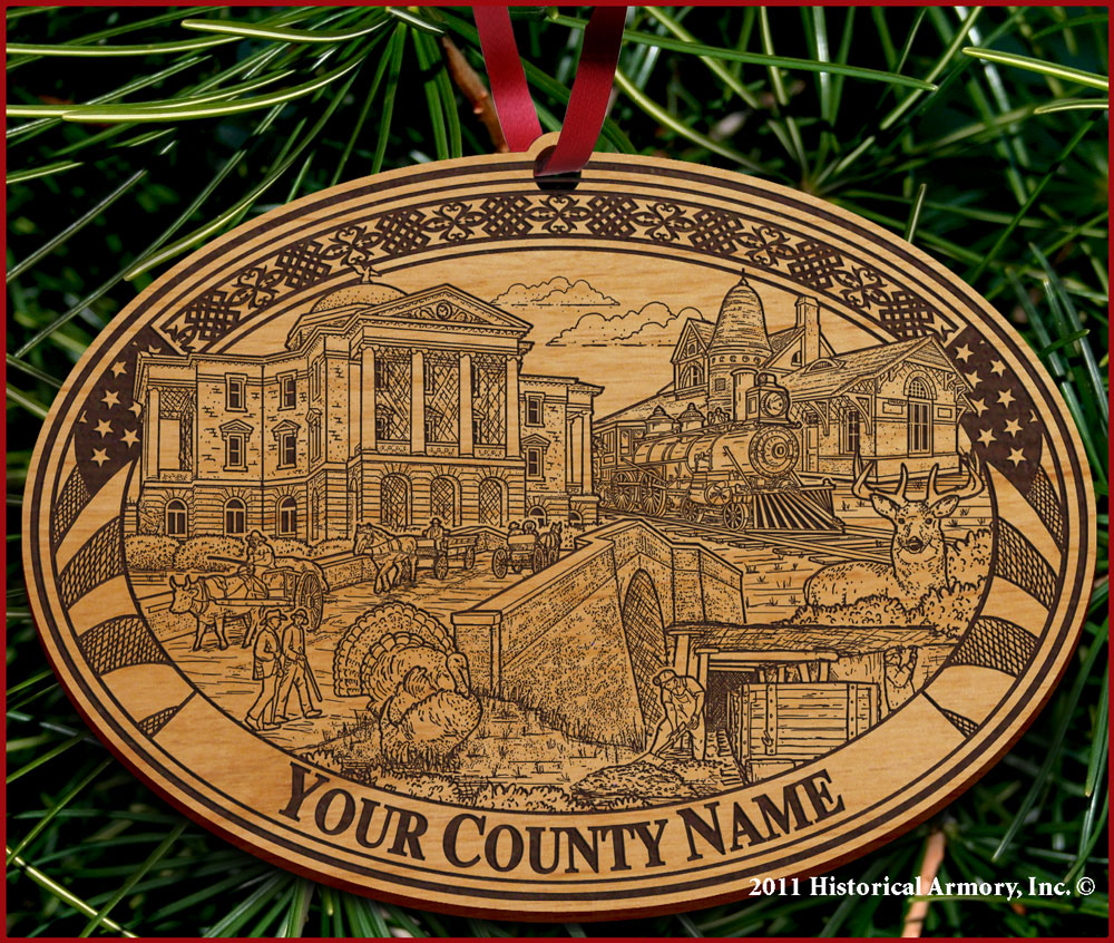 In honor of your county's rich historical legacy, Historical Armory is proud to offer a Christmas ornament showcasing the same artwork that is on your County Edition Rifle. Each ornament combines meticulous research and original artwork, expertly engraved on a piece of finished, Alder wood. An ornament can be made for any county in which we have already have a limited edition rifle. CALL NOW to get your ornament in time for Christmas this year!